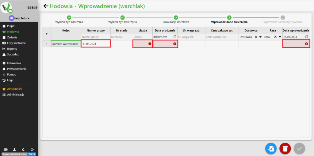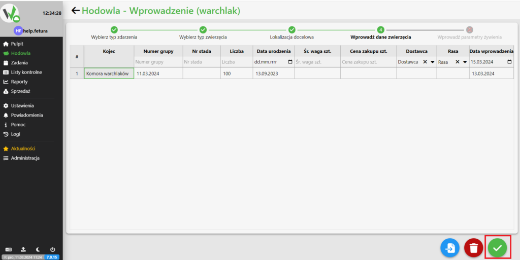 After selecting a sector, click the button in the lower right corner to go to the form for entering a group of piglets.