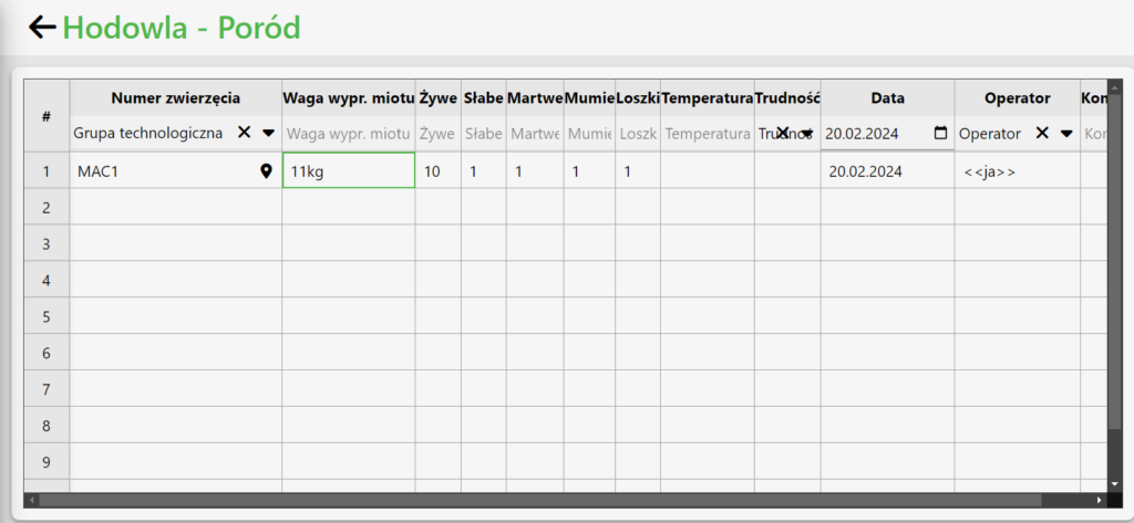 Enter the birthing result: After selecting the appropriate sow, enter the birth result: