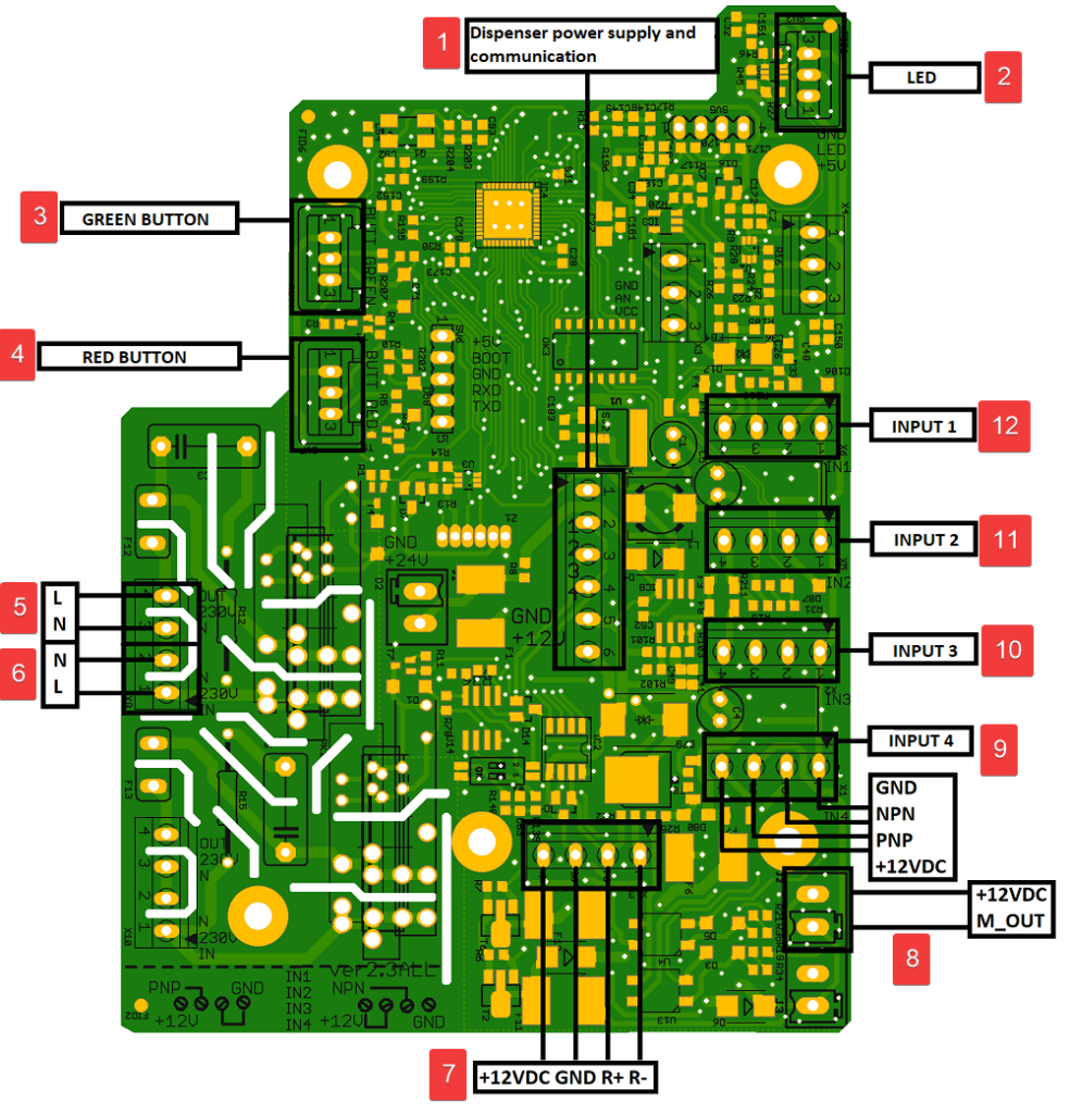 | 1 | Dispenser power and communication (cables in order from top: red, blue, pink, gray, yellow, green) |