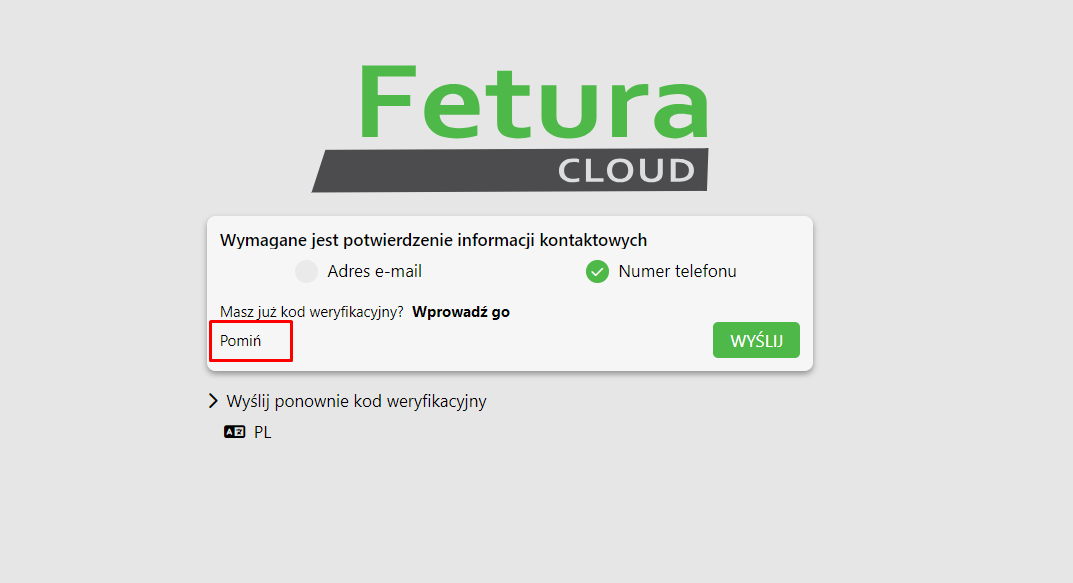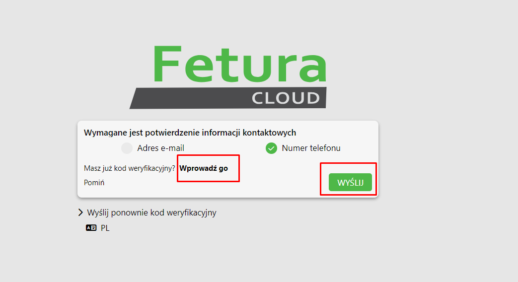 - System poprosi Cię o weryfikację adresu e-mail oraz numeru telefonu. Aby to zrobić, zaznacz konkretną opcję (telefon lub e-mail) i kliknij „Wyślij”.